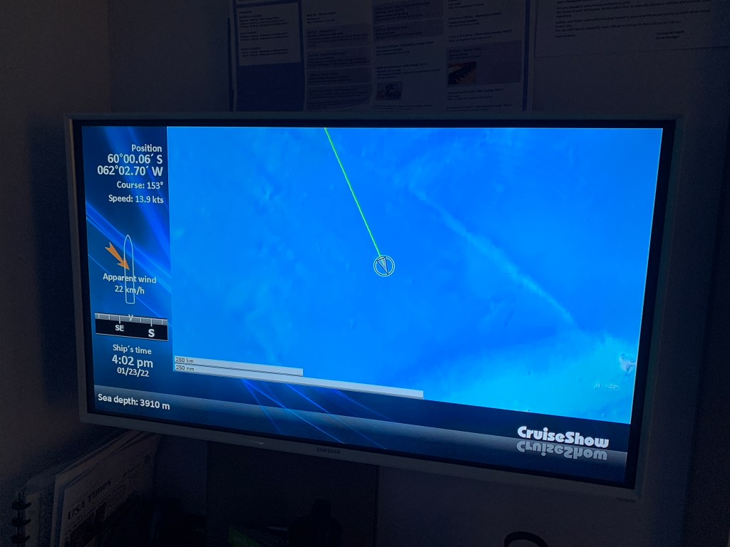 At 4pm Argentina Time (2pm Eastern Time) we crossed 60 degrees latitude south that defines the Southern Ocean, the Antarctic Treaty Region and is the approximate location of the Antarctic convergence. We are officially sailing the Southern Ocean!