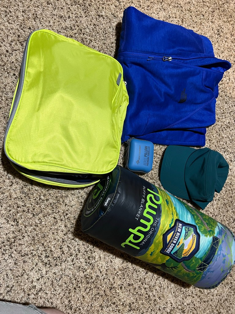 Why a hiking backpack for a carry on? We’ve found that using a hiking backpack as our carry on is easy to navigate through the airport. We each have a Rumpl puffy blanket and backpacking pillow for travel and a hiking backpack let’s us stuff this blanket in the sleeping bag compartment of the backpack.